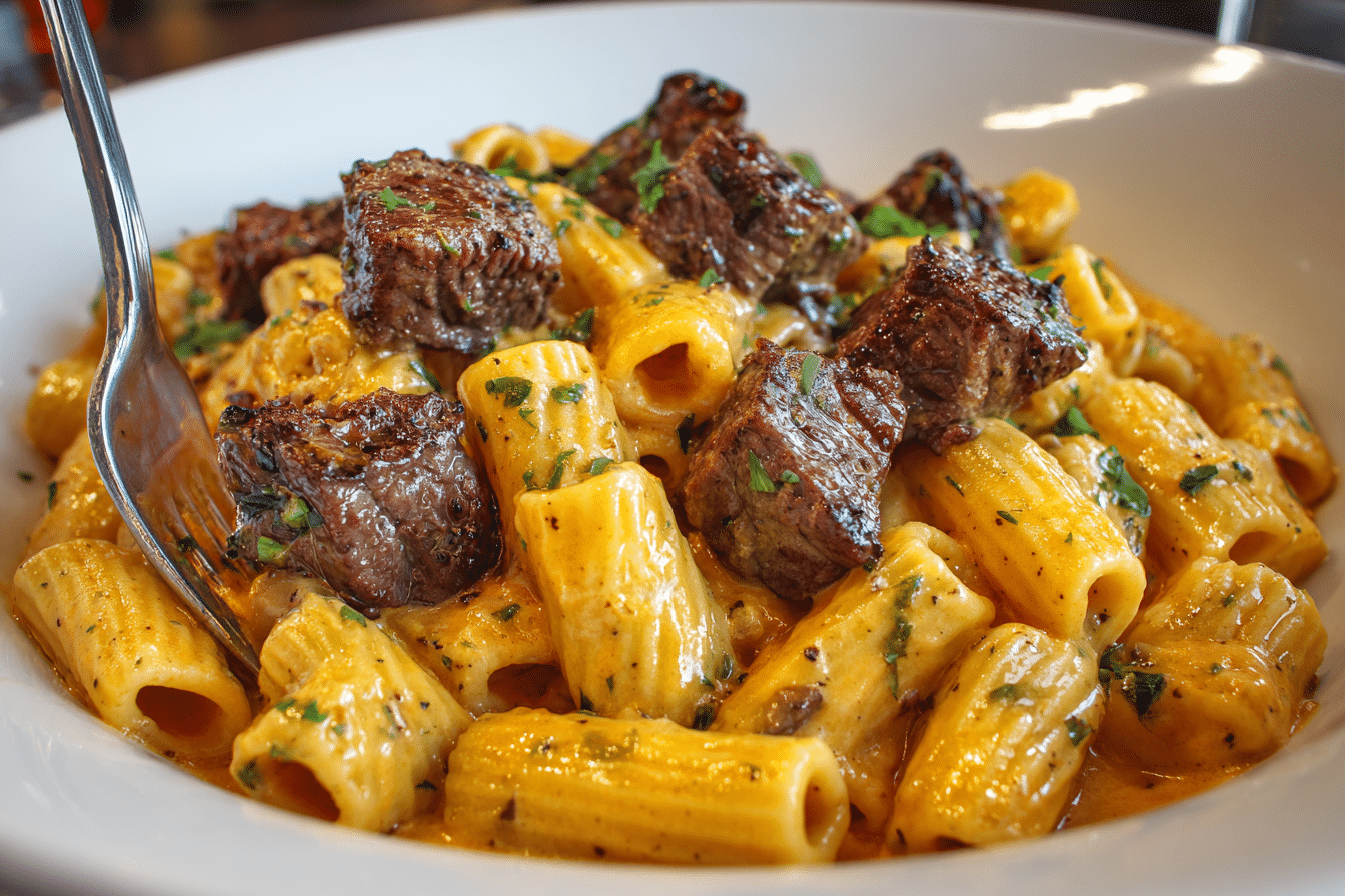 Add drained rigatoni to the sauce. Stir to coat. Return steak tips to the skillet, toss to combine, and warm through for 1–2 minutes.