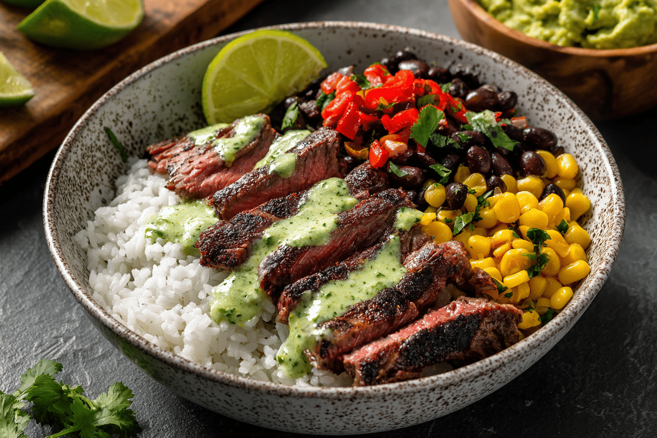 Juicy cilantro lime marinated steak, seared and sliced thin, served over rice with fresh toppings like black beans, corn, avocado, and tomatoes. A zesty, protein-packed bowl ready in 30 minutes.
