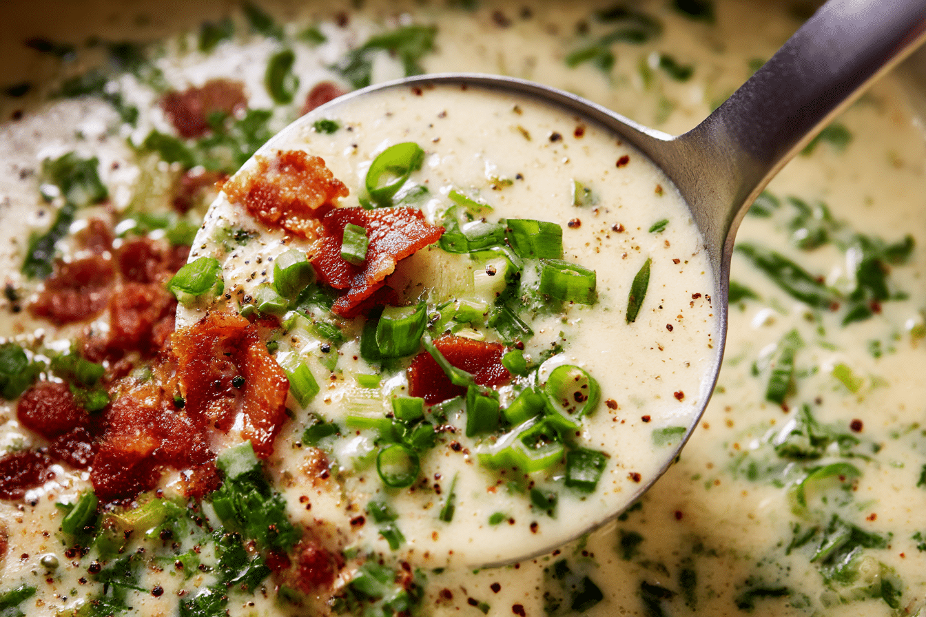 Creamy Irish Colcannon Soup with Kale and Bacon featuring tender potatoes, hearty kale, and smoky bacon simmered in a rich, velvety broth.