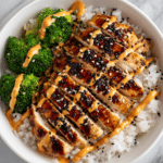 These Delicious Sticky Chicken Rice Bowls are everything you crave in one comforting meal—juicy chicken glazed in a glossy sweet-and-savory sauce, served over fluffy rice and paired with crisp, fresh veggies. Every bite balances tender meat, sticky glaze, and satisfying texture.