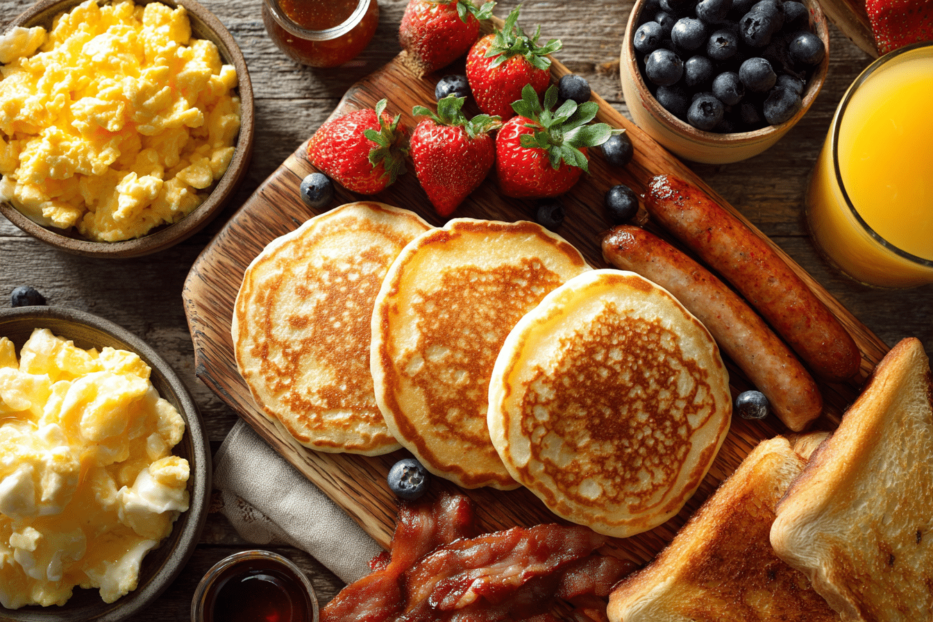 Aim for 4–6 items: one egg-based main, a carb (like toast or pastry), fruit, a savory platter, a sweet item, and drinks. That keeps things simple but satisfying.