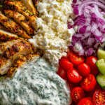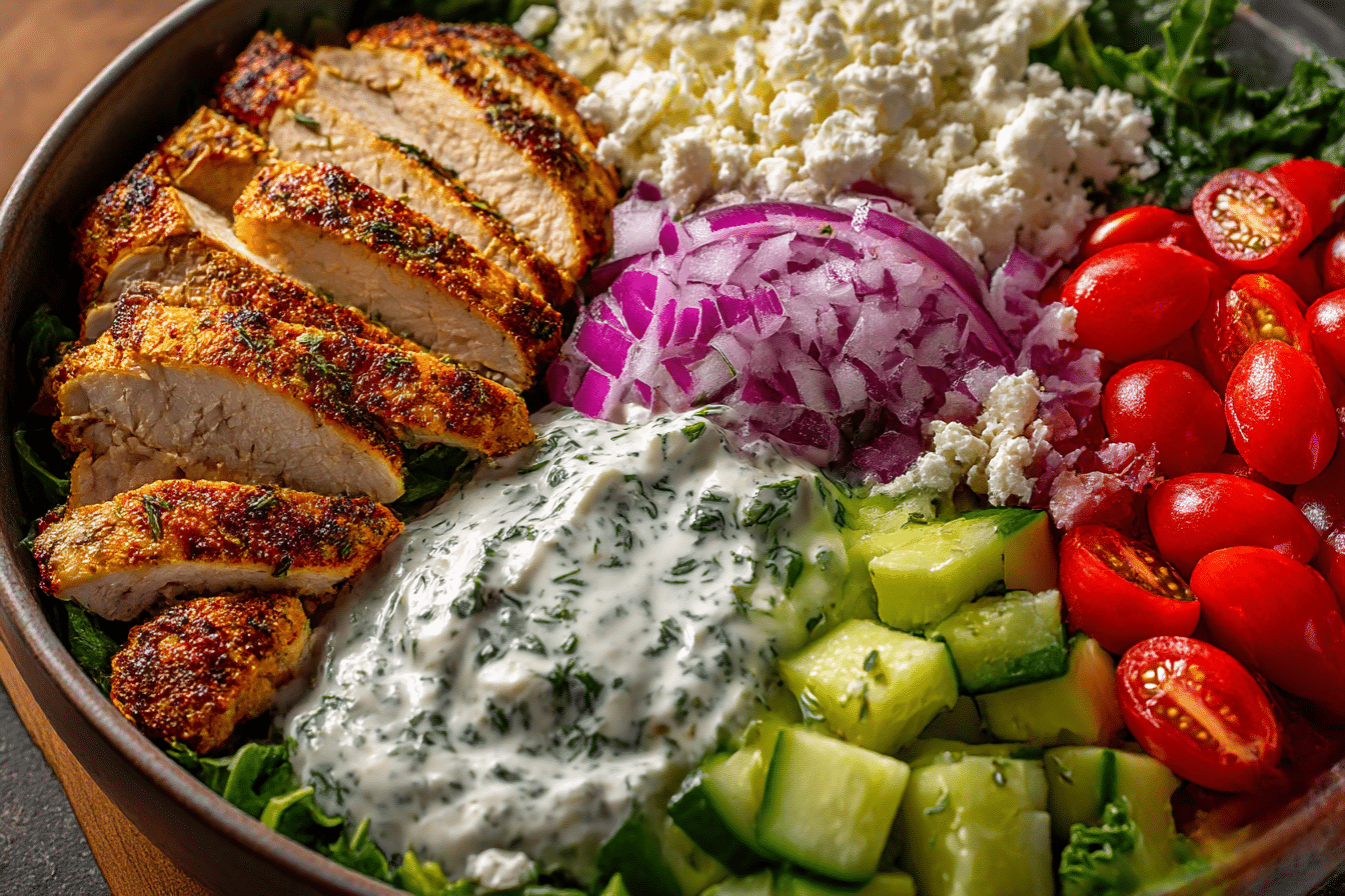 Inspired by classic Mediterranean ingredients, these bowls deliver brightness from lemon, richness from olive oil, and freshness from herbs and vegetables. Every bite offers contrast between warm grilled chicken and cool, crunchy toppings.