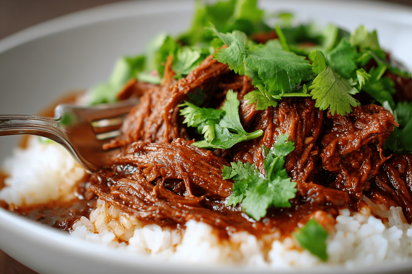 Inspired by the rich depth of traditional Korean marinades, this dish features soy sauce, garlic, ginger, sesame oil, and a touch of gochujang to create a glossy, sticky glaze that seeps into every fiber of the meat. Slow-roasted until fork-tender, the beef falls apart in savory, spicy-sweet shreds that beg to be piled over steamed rice, tucked into lettuce wraps, or eaten straight from the pan.
