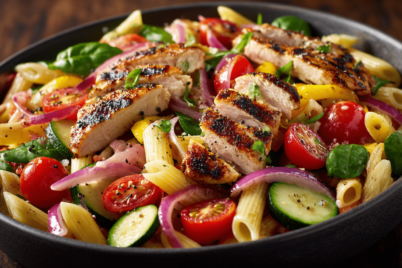 Mediterranean Chicken Pasta Salad combines tender pasta, grilled chicken, fresh vegetables, olives, and feta tossed in a light lemon olive oil dressing.