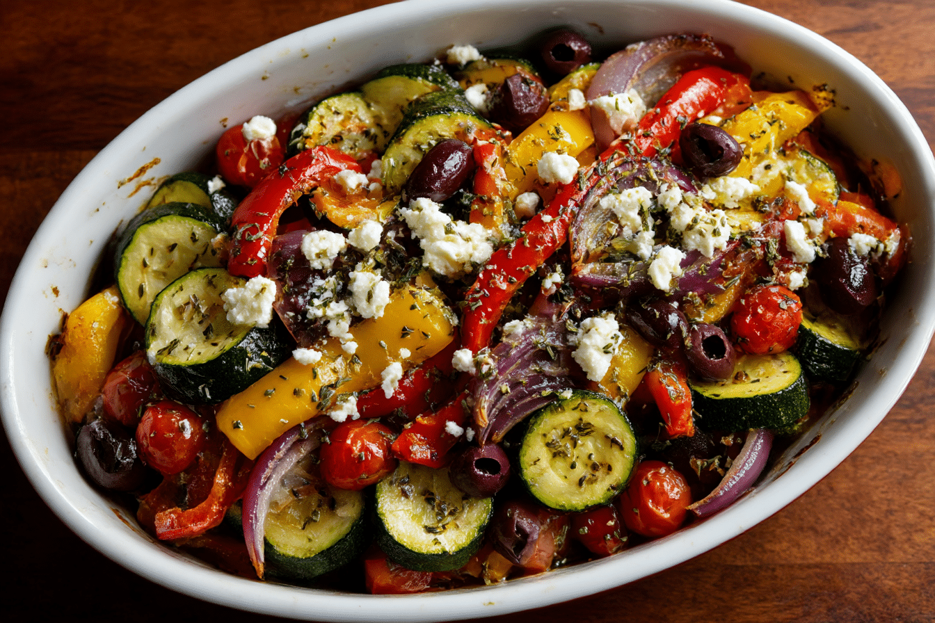 A colorful medley of Greek vegetables roasted in one pan with herbs, garlic, and feta.