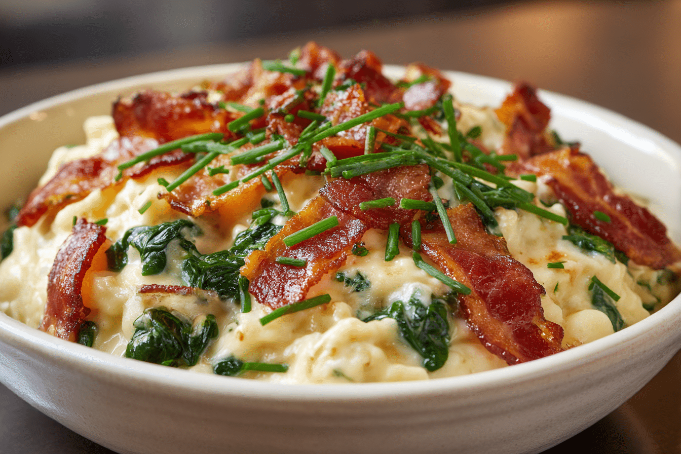 6. Fold in the crumbled bacon, reserving a few pieces for garnish. Heat through for 2–3 minutes to meld flavors.