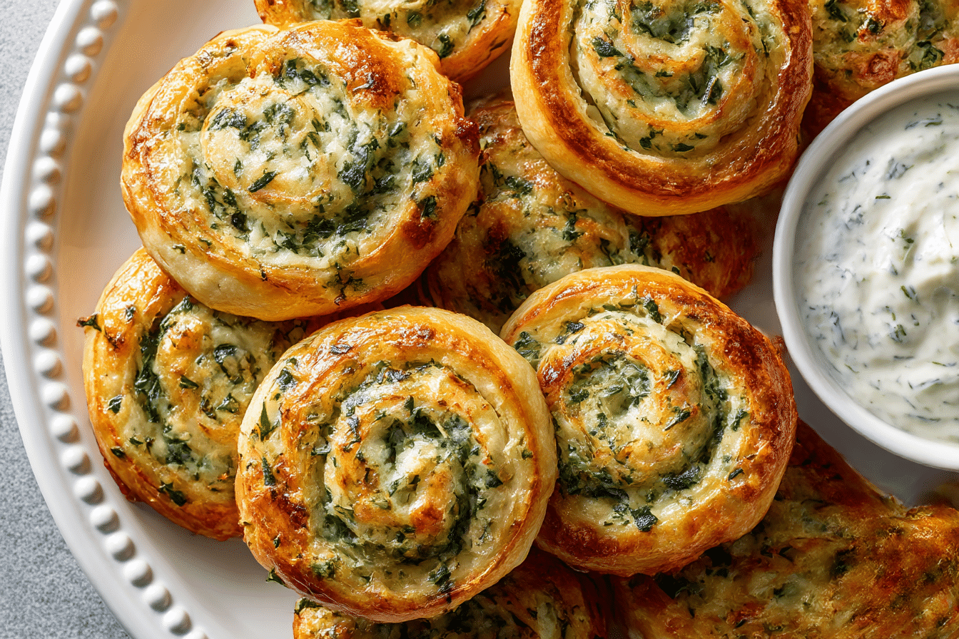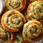 Spinach and Feta Pinwheels are flaky pastry spirals filled with savory spinach, feta cheese, and herbs inspired by classic Greek spanakopita.