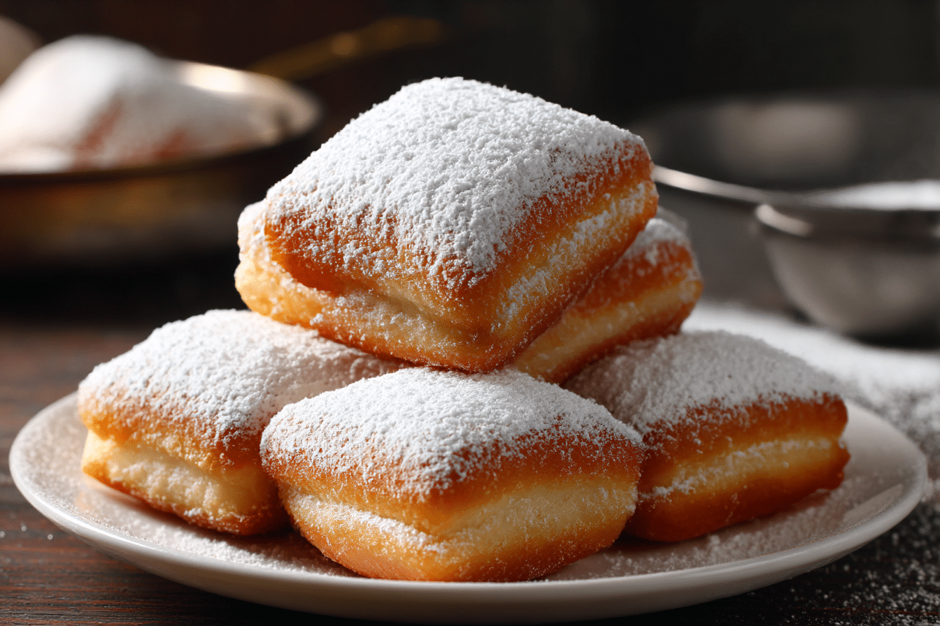 Powdered sugar is essential for finishing, creating the classic beignet presentation.